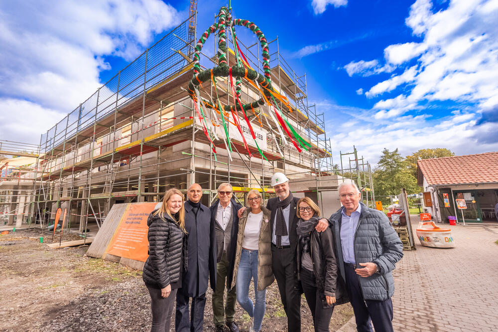 Feierten gemeinsam mit vielen Gästen das Richtfest des Kinder- und Jugendgästehauses der help and hope Stiftung: Patricia Aundrup (Stiftungsvorstand), Alexander Kalouti (designierter Oberbürgermeister der Stadt Dortmund), Prof. Dr. Lutz Aderhold (Stiftungskuratorium), Sandra Heller (Vorstandsvorsitzende der help and hope Stiftung), Michael Freundlieb (FREUNDLIEB Bauunternehmung), Nadja Lüders (Stiftungskuratorium), Gerhard Gotthard (Stiftungsvorstand). Foto: help and hope Stiftung / Stephan Schütze