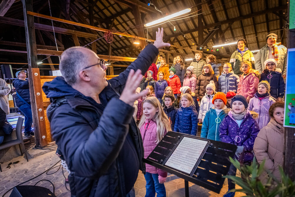 Mit zunehmender Dämmerung setzte sich der Martinszug in Bewegung. Der 1. Bataillonsspielmannszug des BSV 1564 Obercastrop e.V. begleitete die Familien musikalisch auf ihrem Weg über das Gelände, während der Kinderchor der Akademie für Gesang NRW mit 70 jungen Sängerinnen und Sängern für bewegende musikalische Momente sorgte. Anschließend verfolgten die Kinder gespannt die szenische Darstellung der Geschichte des heiligen Martin.
